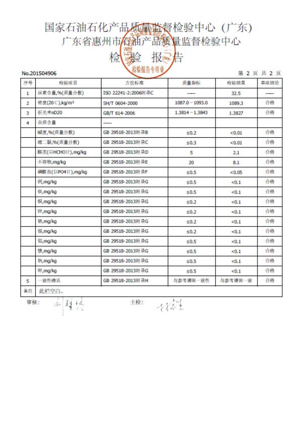 ? ? ? ? 2015年6月1日,我司的“驭蓝柴油尾气处理液”通过了第三方——国家石油石化产品质量监督检验中心(广东省惠州市石油产品质量监督检验中心)的检测,其中多个检测项目包括:密度、折光度、碱度、缩二脲含量、醛类指标、不溶物含量、磷酸盐含量,检测出来的指标都远远低于国家规定标准,其他的重金属铝、钙、钾、钠、铜、铁、镁、镍、锌、铬都均未检测出来,就连红外定性也与标准谱图一致,相关技术指标均符合国家GB 29518-2013《尿素水溶液》的严格标准,最后“驭蓝”顺利地拿到了合格的检测报告。