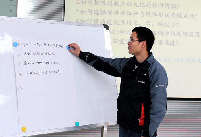 ? ? ? ? 柳工集团《柳工机械》报主编、高级宣传主管谭金红同志应邀到会指导授课。谭金红针对如何发现新闻和写好新闻做了详细的指导,还以柳工集团一些大事件稿件举例说明,同时提出了“列报道重点亮点、寻找和发现新闻点、与领导、编辑多沟通”等宝贵建议。课后参会人员分成3组就如何搞好公司宣传工作和企业文化工作进行热烈讨论并进行成果阐述,第1组以最切实可行的建议条数最多获得金点子建议奖。