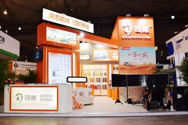 司能延续“一带一路”理念,以穿插的展台结构,重工的机械风格,带你重走不一样的丝绸之路。以司能橘及暖灰为主打色调,简洁的集装箱元素布局全场,前厅,大幅灯箱画面展现公司实力。后场,各子品牌产品以实物及画面的形式共同展示。