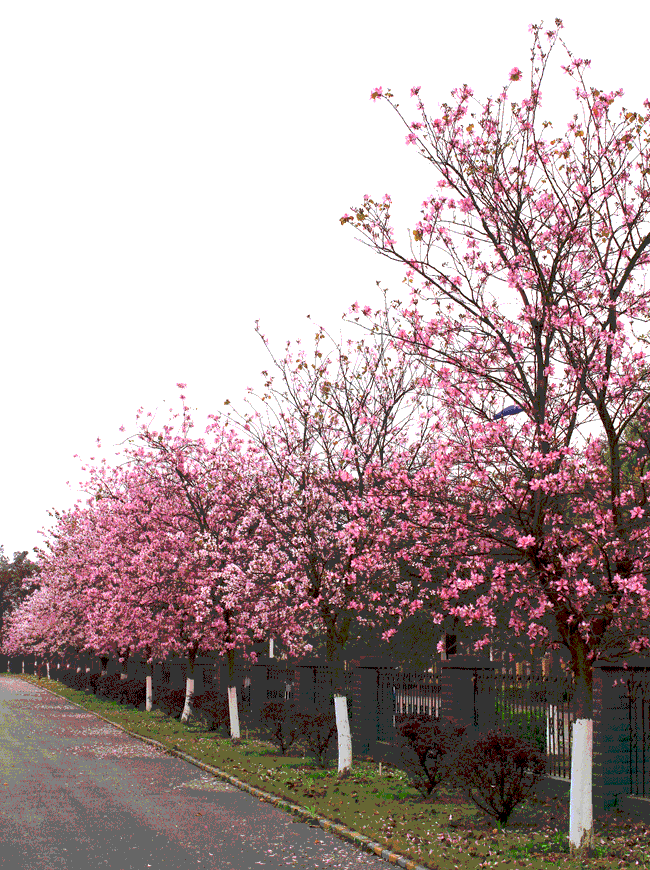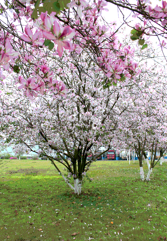 紫荆花树冠雅致,花大而艳丽,是热带、亚热带观赏树种之佳品。宜作行道树、庭荫风景树。紫?;ㄓ纸泻旎ㄗ暇?、洋紫荆、红花羊蹄甲,为苏木科常绿中等乔木,叶片有圆形、宽卵形或肾形,但顶端都裂为两半,叶形如牛、羊之蹄甲,故有此名。
