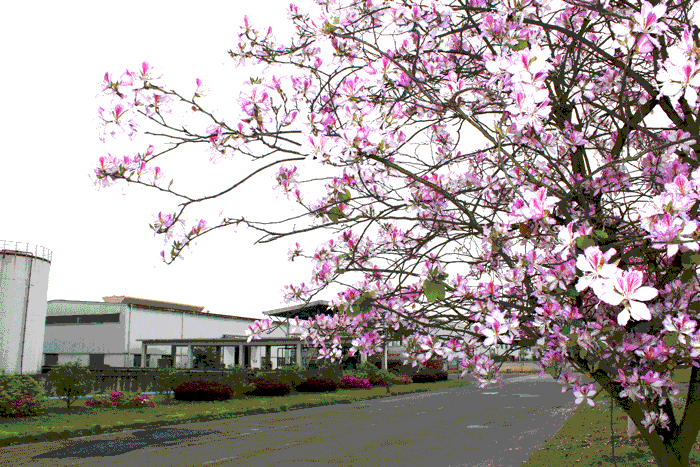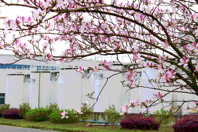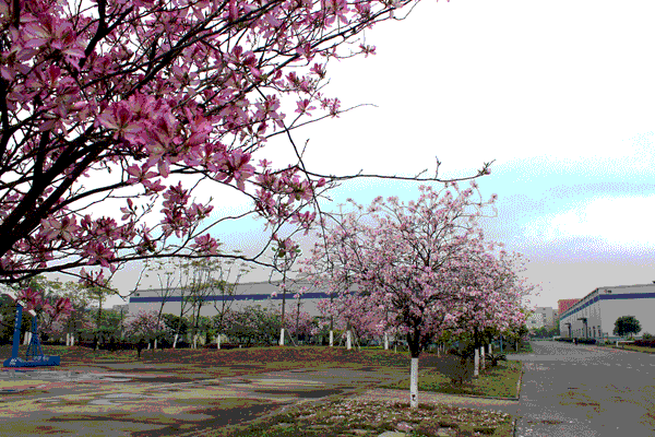 柳州基地里的紫?;ê?,鲜艳绮丽,幽香扑鼻。身处办公楼里无须开窗,都会被浓郁的花香熏醉。