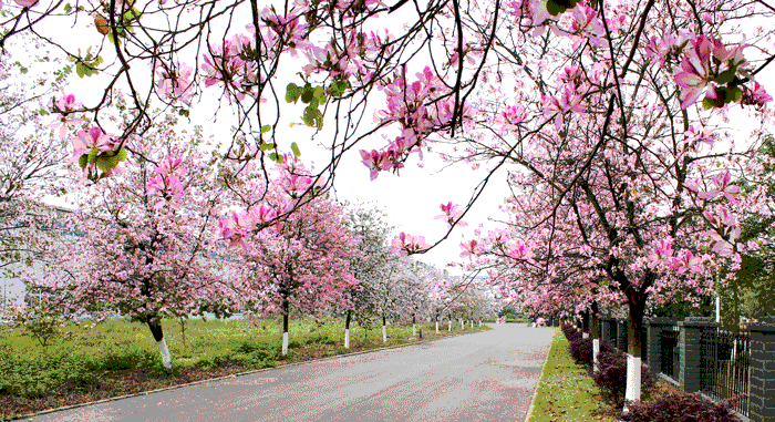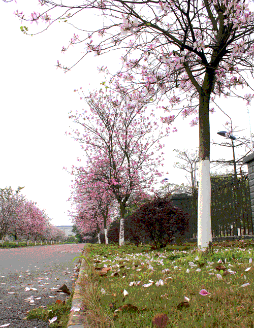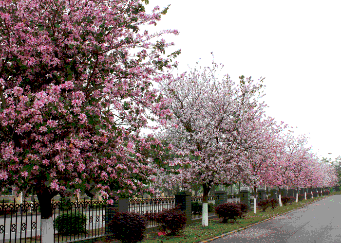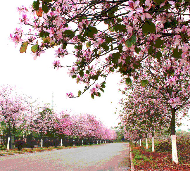 紫?;ǖ淖叩?,一棵一棵的紫?;ㄊ鳎欢湟欢涞淖暇;ǘ?,立在走道的两旁,特别有情趣、浪漫。紫荆花,怒放着,绚丽多彩。