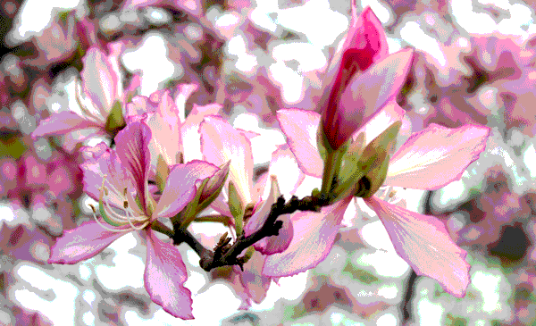 紫荆花花大如掌,略带芳香,红色或粉红色的五片花瓣均匀地轮生排列,十分美观。