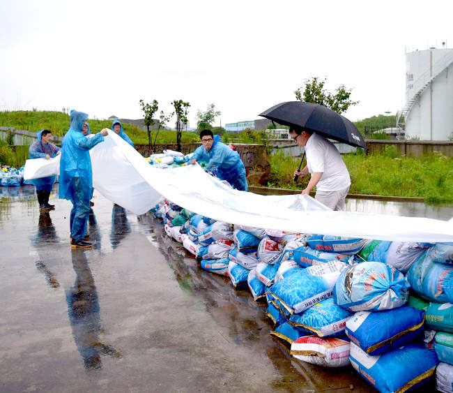 ? ? ? ? 2016年6月28日中午12时左右,溧阳地区连续强降雨使芜申运河水位由早上8点的4.5米急速上升至5.5米,水面距离公司码头驳岸距离不到0.5米。发现这一情况,司能石化常务副总经理吴土金立即组织和号召江苏司能防汛抗洪小组第一时间紧急启动一系列防汛抗洪应急措施: